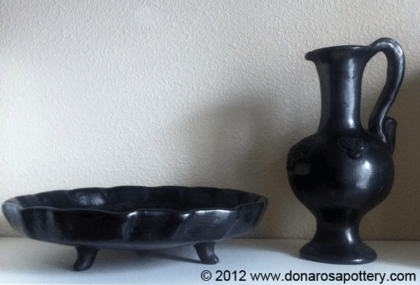Doña Rosa discovered in the 1950s that she could change the color and shine of her ceramics using a technique still employed. She would polish it with a quartz stone before firing. This compresses the surface of the clay before it is completely dry. Then by firing at slightly lower temperature than normal, the result is a much more shinny surface. This tends to produce a more brittle pottery, so it is more ornemental than functional. She produced a wide variety of vessels and figures.